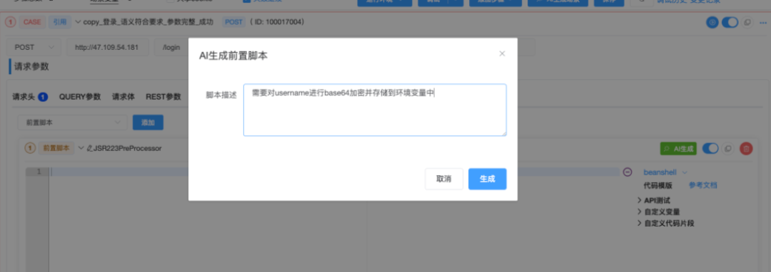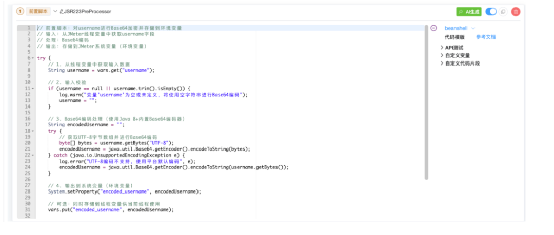 测试前置脚本编写常涉及复杂的数据预处理或变量初始化,要求测试人员具备相当的编码能力。而智能接口测试平台集成的AI脚本助手支持Groovy、Python、Beanshell、JavaScript等多种语言,用户只需用自然语言描述预处理需求(如“需要对username进行base64加密并存储到环境变量中”),AI便能理解意图并生成准确、可执行的脚本代码。这不仅降低了脚本编写门槛,更保证了脚本的规范性与可维护性。