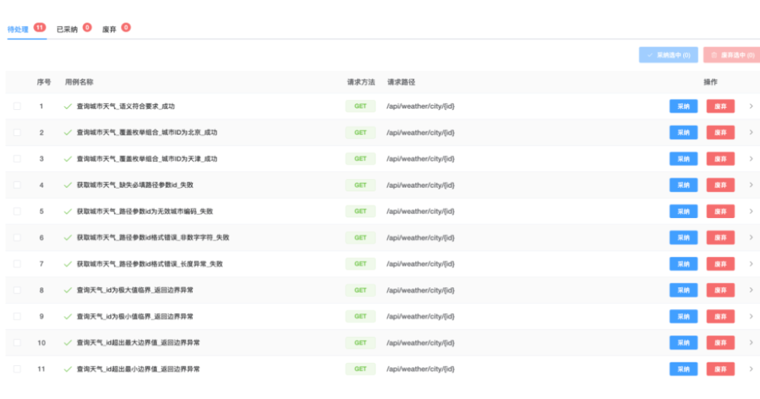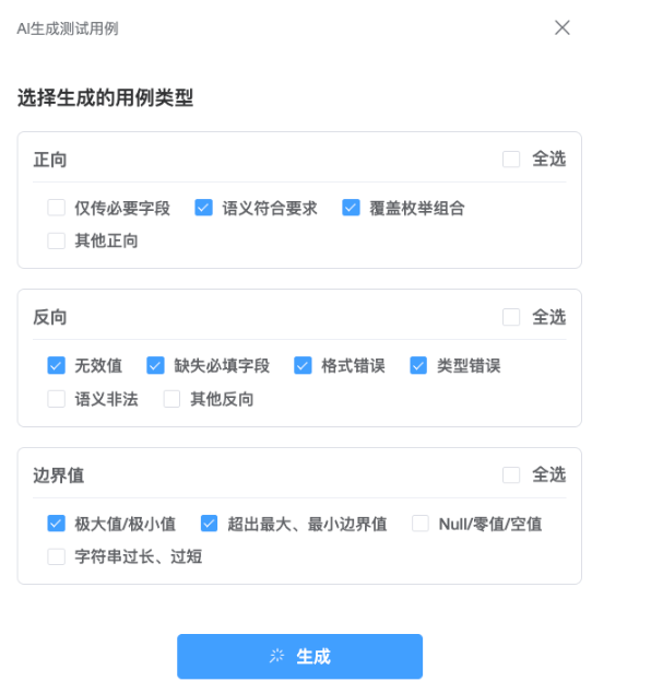 例如,对于必填字段,AI会自动生成包含空值、超长值、非法格式等反向测试用例;对于数值型参数,会自动生成边界值测试用例。在实际操作中,测试人员只需选择需要生成的用例类型(正向验证、异常校验、边界测试等),AI即可在数秒内生成多条高质量测试用例,且支持用户对生成结果进行逐条采纳或废弃的交互操作。