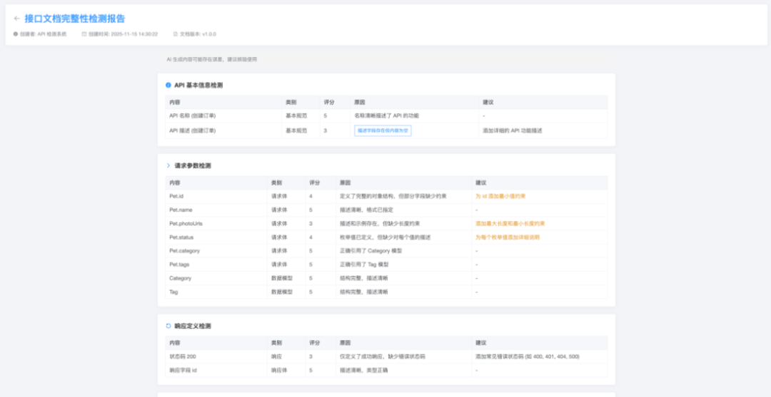 ● 精准定位与可行建议:针对问题给出可操作改进建议,例如完善API描述或添加错误状态码。