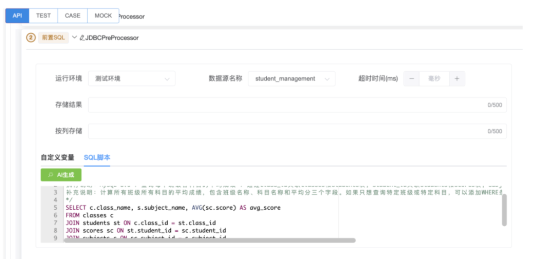 数据库操作是接口测试的重要环节,但编写精准的SQL脚本往往要求测试工程师具备一定的编码功底。而智能接口测试平台允许用户用自然语言描述生成SQL的需求。平台在连接数据库后,能自动扫描表结构与字段注释,然后AI将深度分析接口业务逻辑(如数据初始化、多表关联),自动生成建表、插数、关联查询等SQL,覆盖接口依赖的所有数据准备场景,这一功能让测试数据管理变得直观而高效。平台支持MySQL、Oracle等主流数据库,结合所选“数据源名称”匹配语法规范,生成无语法错误SQL;同步兼容“运行环境”“超时时间”等平台配置,保障SQL在目标环境稳定执行。