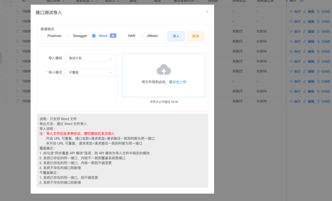 手动从Word、PDF等非结构化格式的接口文档中提取信息是一项极其繁琐的工作。测试人员需要花费时间逐项识别接口名称、请求方法、参数定义、默认值以及响应格式等关键要素,然后手动输入到接口测试工具中。而智能接口测试平台则通过集成多模态大模型技术,实现了接口文档的自动化解析。平台支持高效处理多种常用接口文档格式,包括word, pdf, har, swagger等等。大模型能够智能识别上传文档的结构,精准提取接口的详细信息,包括HTTP方法、参数类型、必填项、响应代码和数据结构等,并支持一键导入到系统。这不仅显著节省了手工录入所需的大量时间和精力,还大大避免了因人为因素造成的信息错漏。