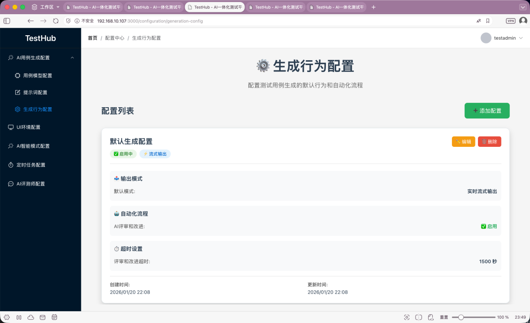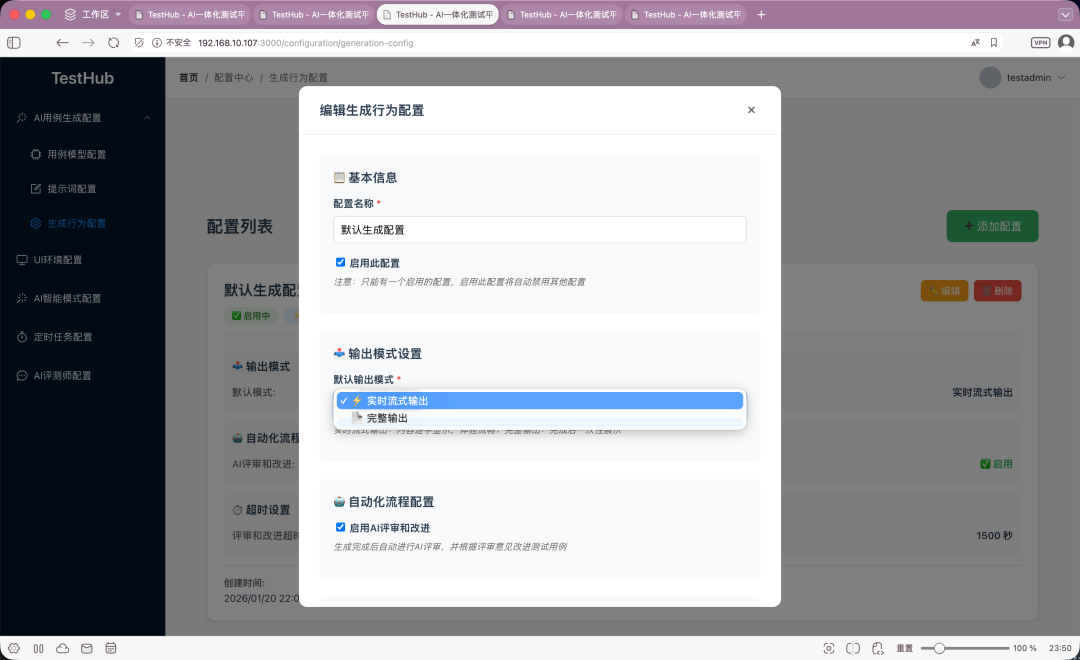 Ai用例生成配置下,这次增加了一个生成行为配置。主要用于配置默认输出模式:实时流式输出和完整输出。完整输出是我们上一版本的模式,很多小伙伴反馈在这个模式下,等待的时间比较长,体验不友好,所以这次特地加了流式输出。关于流式输出的功能,下面会做重点介绍。