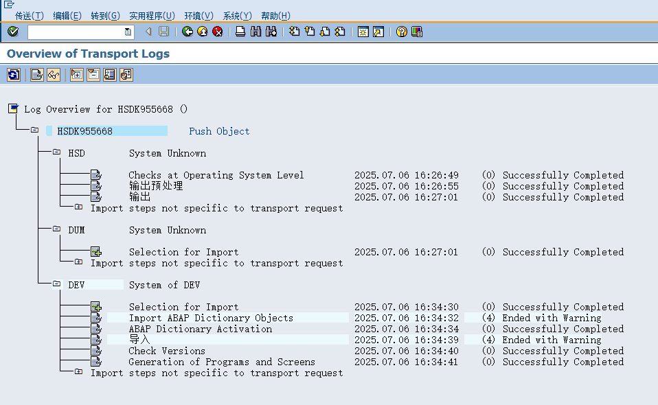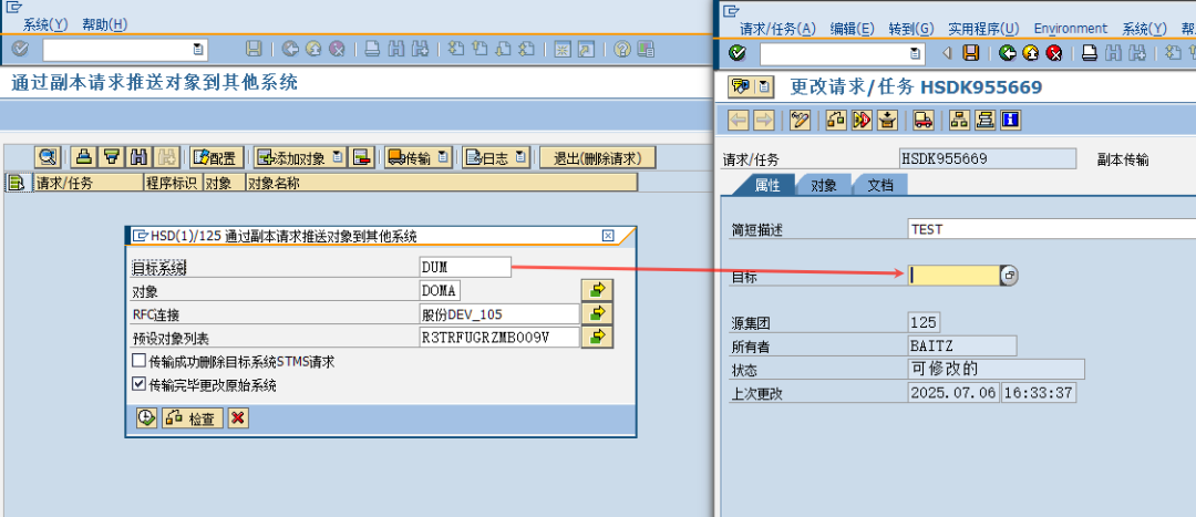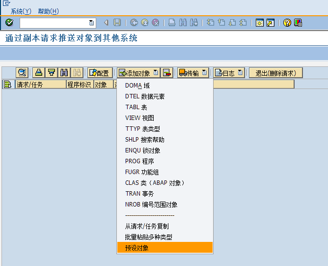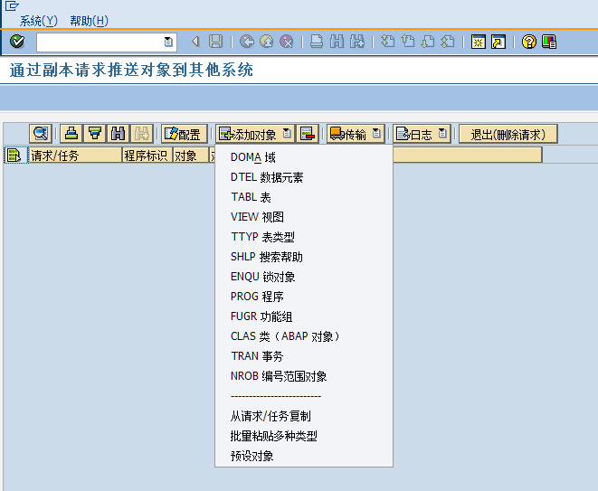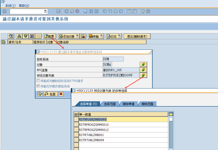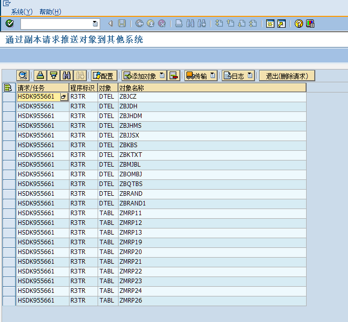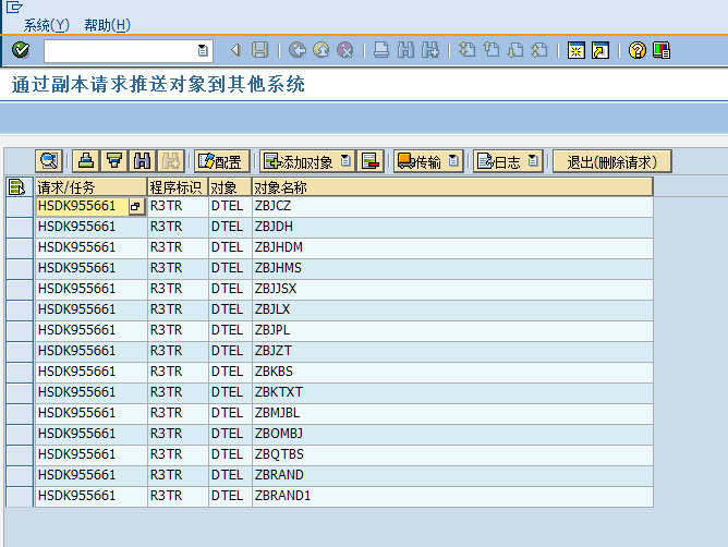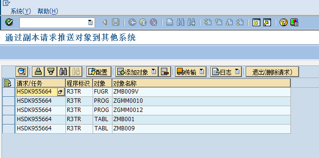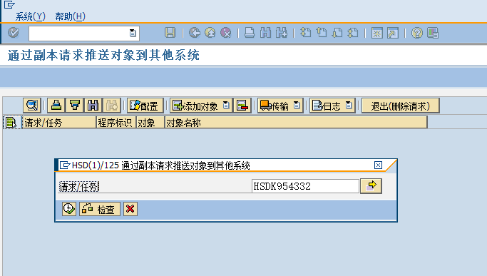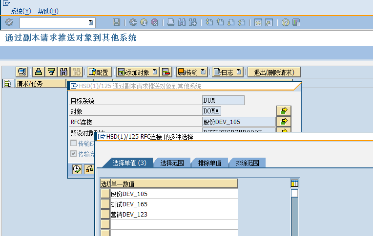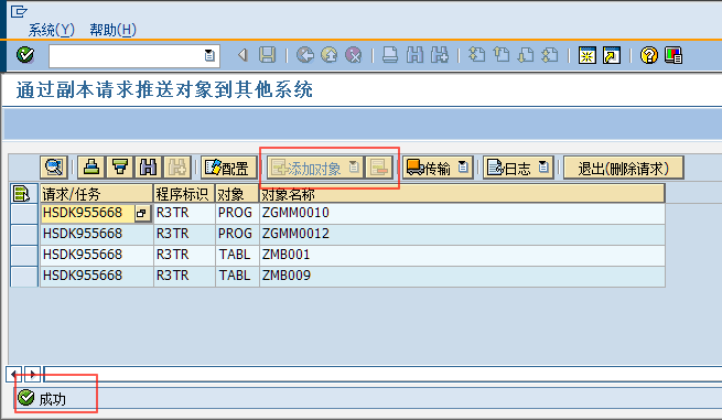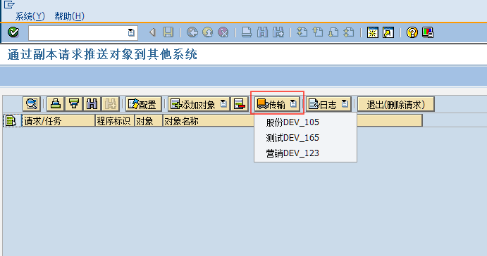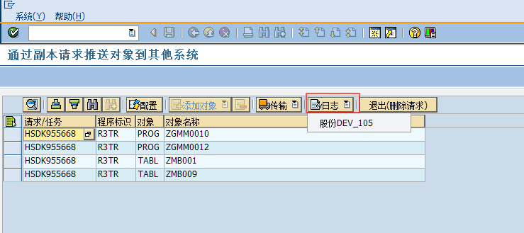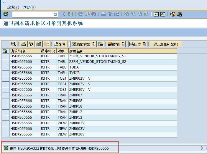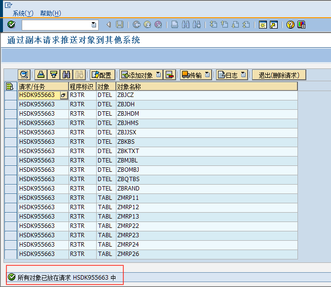 比如我线传输到“股份DEV_105”,在传输完毕,会在状态栏显示传输是否成功,并且因为请求已经释放,添加和删除对象的按钮也会变灰,不能再修改列表的内容。如果还需要继续往其他系统传输,再继续这个步骤即可。