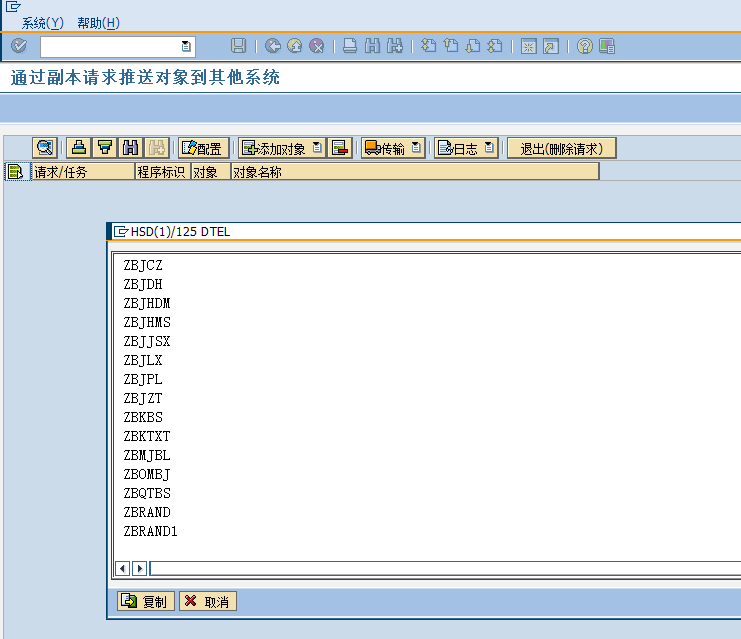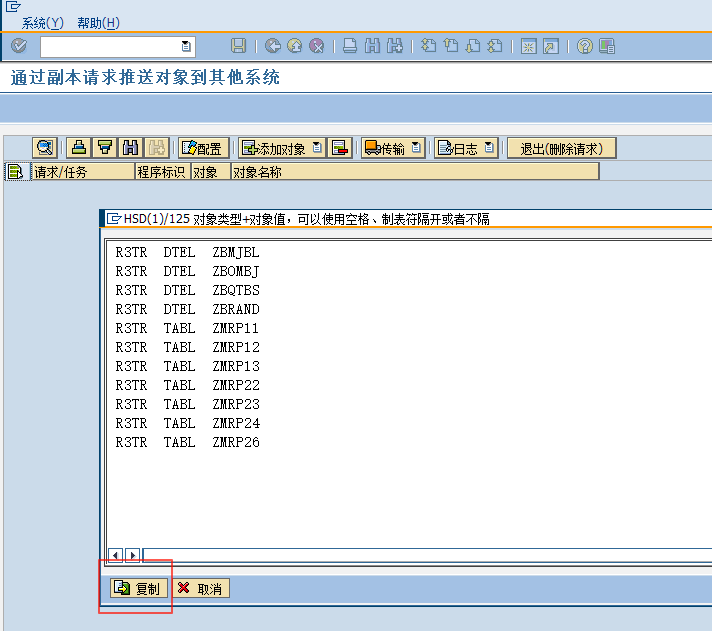 比如我需要传输一些数据元素和表,则可以先点击“DTEL 数据元素”,把需要传输的数据元素粘贴到弹出的窗口,点击“复制”
