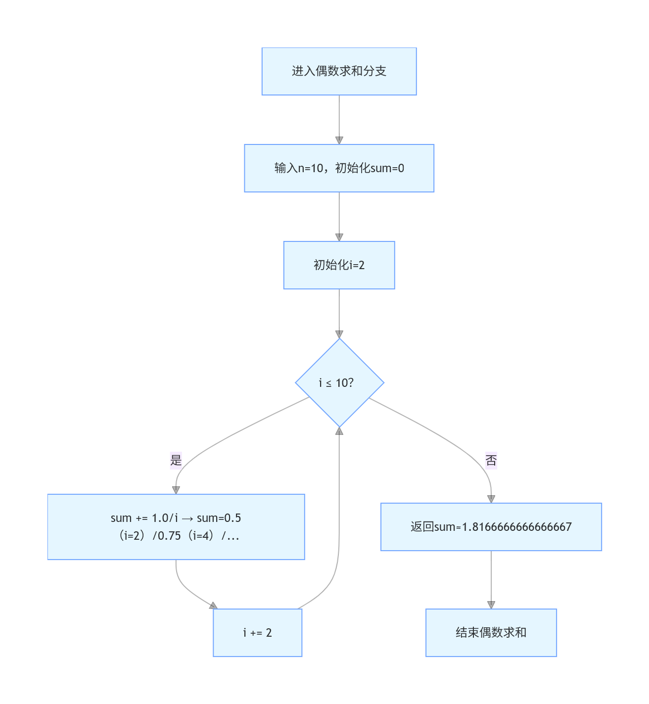 }main 方法):n 值:n1 为偶数(6),n2 为奇数(7)。calculateSum 方法并打印结果。calculateSum 方法:n 作为参数。if 语句判断 n 是奇数还是偶数。n 是偶数,使用 for 循环从 2 开始,每次增加 2,直到 n,计算 1/2 + 1/4 + ... + 1/n。n 是奇数,使用 for 循环从 1 开始,每次增加 2,直到 n,计算 1/1 + 1/3 + ... + 1/n。当你运行这个程序时,输出将会是: