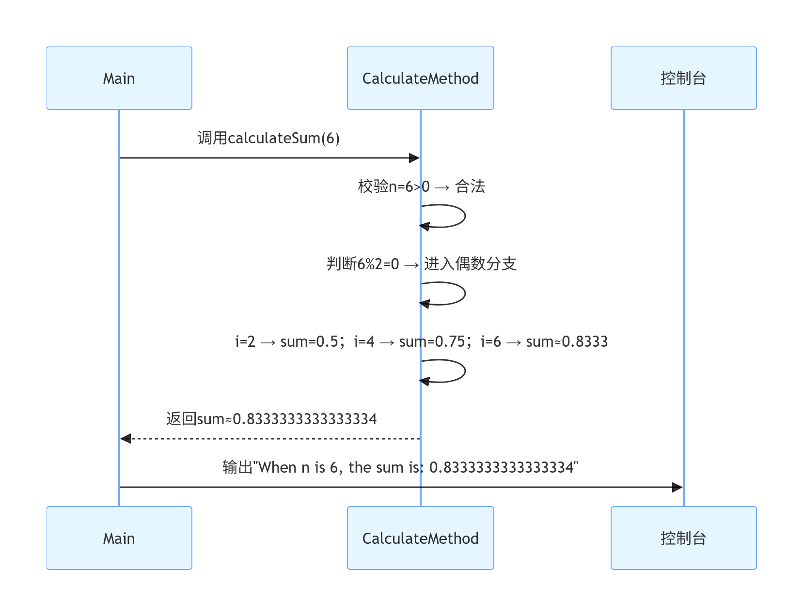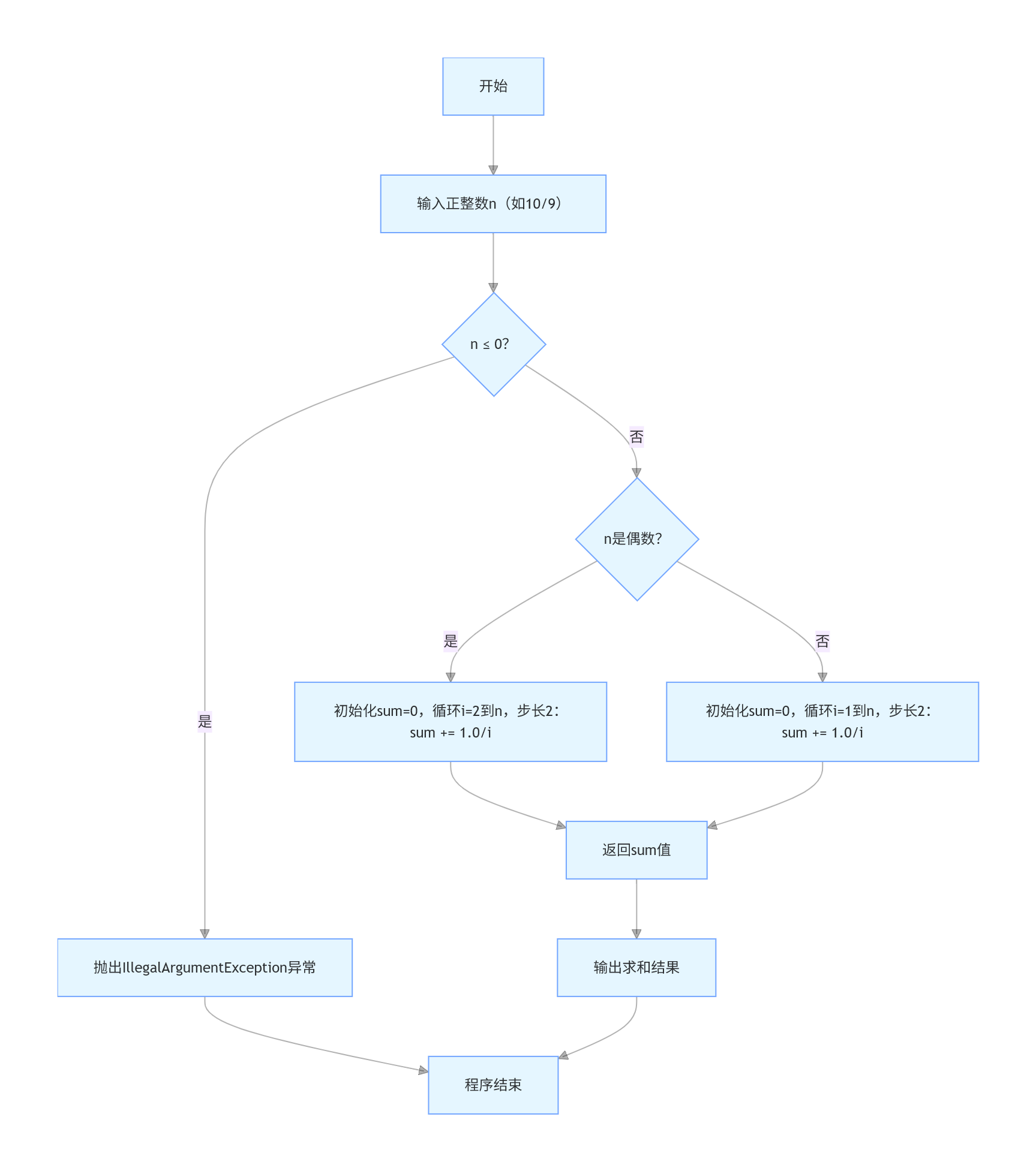 SequenceSum 类包含 main 方法,这是程序的入口点。main 方法中,定义了一个变量 n 来存储输入值,并调用 calculateSum 方法计算结果,最后打印结果。n 作为参数,并返回一个双精度浮点数表示的序列和。n 是否为正整数,如果不是,则抛出 IllegalArgumentException 异常。if 语句判断 n 的奇偶性: n 是偶数,使用 for 循环从 2 开始,每次增加 2,直到 n,累加每个项的倒数。n 是奇数,使用 for 循环从 1 开始,每次增加 2,直到 n,累加每个项的倒数。你可以通过修改 main 方法中的 n 的值来测试不同的输入情况。例如: