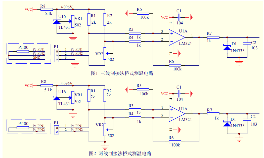 常见解决方案分为两类:桥式测温电路通过电桥不平衡产生压差信号,适合中精度场景;恒流源式电路利用恒定电流产生压降,在宽温范围下稳定性更优。两种电路均需配合 TL431 等基准源提供稳定参考,结合运放放大 mV 级微弱信号后接入 AD 转换。