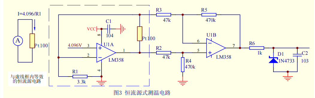 恒流源式电路(图 3)通过 LM358 运放 U1A 将 4.096V 基准转换为恒定电流,流经 Pt100 产生的压降经 U1B 放大 10 倍后输出。