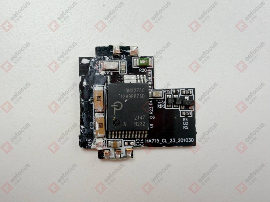 控制小板的电路设计相对简洁,正面最关键的元器件是 PI INN3278C 芯片。