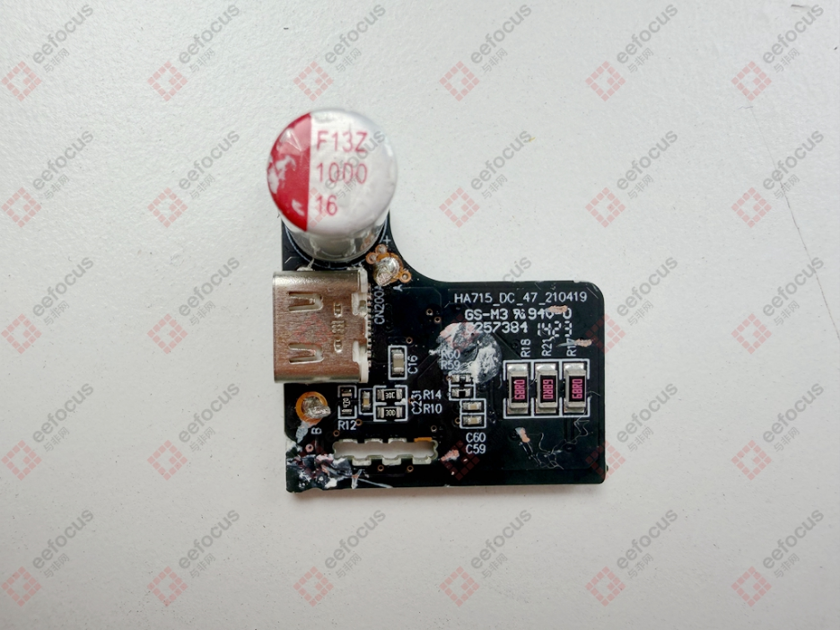 输出端小板的另一面则布局了 USB Type-C 输出接口、用于滤波的固态电容以及其他阻容元器件,共同构成了充电器的输出链路。