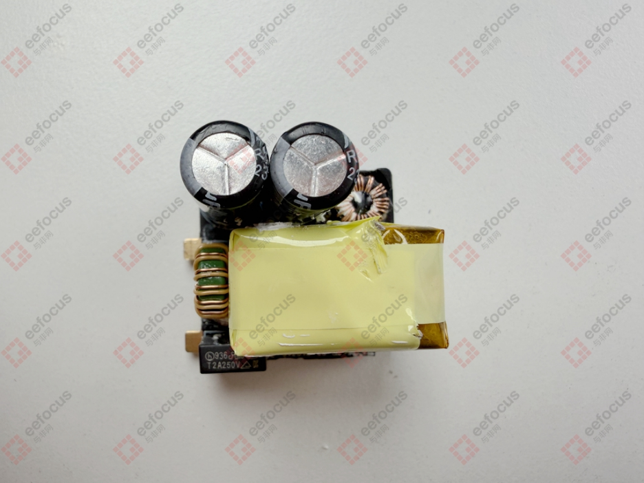 输入端 PCB 小板正面搭载了多种核心元器件,包括延时保险丝、用于滤除 EMI 干扰的输入共模电感、2 颗艾华品牌的高压滤波电解电容、磁环滤波电感以及变压器,这些部件共同构成了电流输入与初步处理的核心链路。