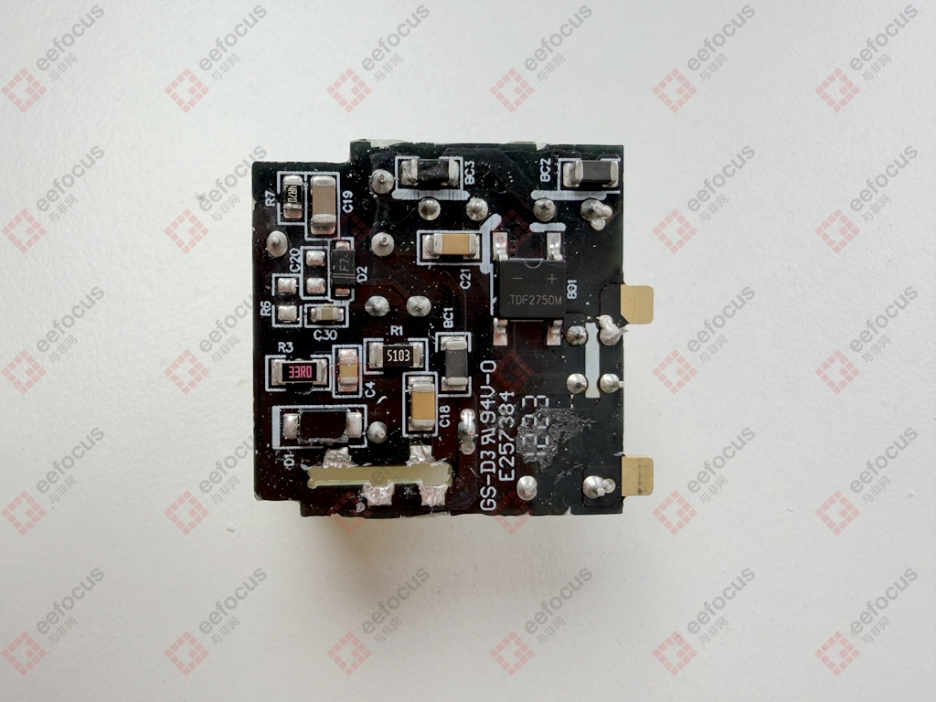 而小板背面仅布局一颗丝印为 TDF2750M 的整流桥,其主要功能是将输入的交流电转换为直流电,为后续电路提供稳定的直流输入。