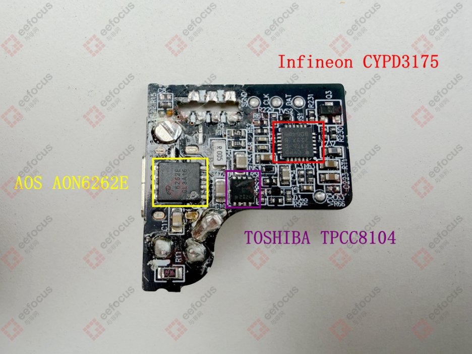 输出端小板汇聚了小米 33W 氮化镓充电器方案中的多颗关键芯片,是实现协议适配与输出控制的核心板块。