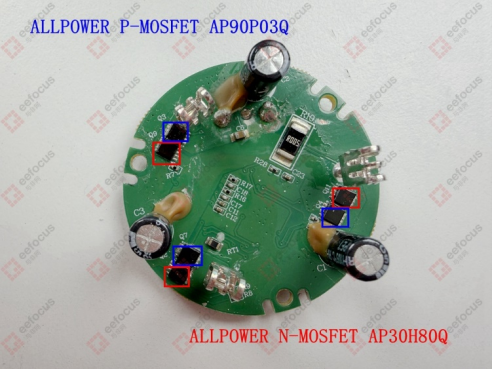 在电机驱动板的背面,设计有3组由铨力电子生产的N沟道金属-氧化物-半导体场效应晶体管(N-MOSFET)与P沟道金属-氧化物-半导体场效应晶体管(P-MOSFET)组成的驱动电路,其中N-MOSFET的型号为AP30H80Q,P-MOSFET的型号为AP90P03Q,两者配合可实现电机的高效驱动与精准控制。