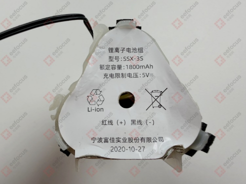 供电电池则选用了宁波富佳实业股份有限公司生产的锂离子电池组,型号为SSX-3S,额定容量为1800mAh,能够为设备提供稳定的续航支持,满足日常随手清洁的续航需求。