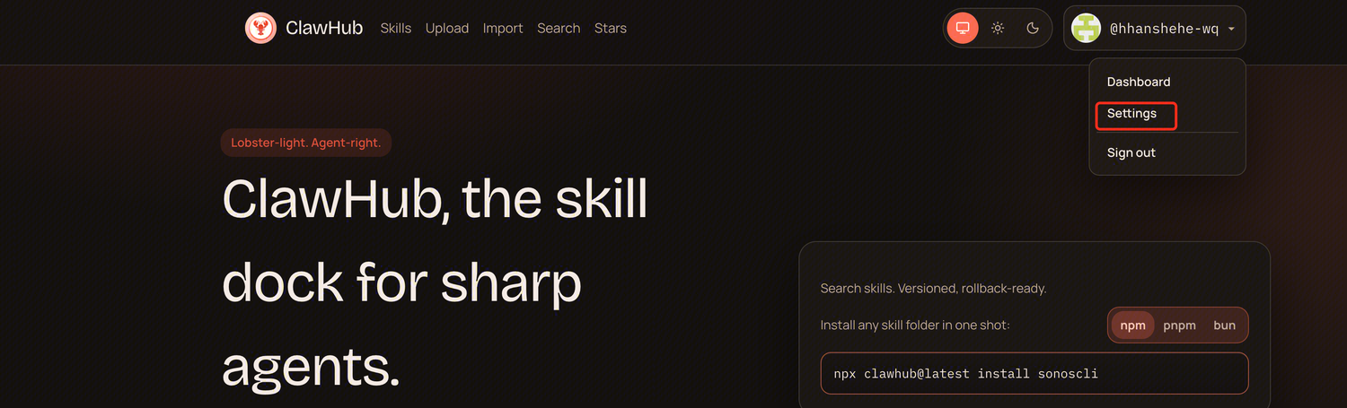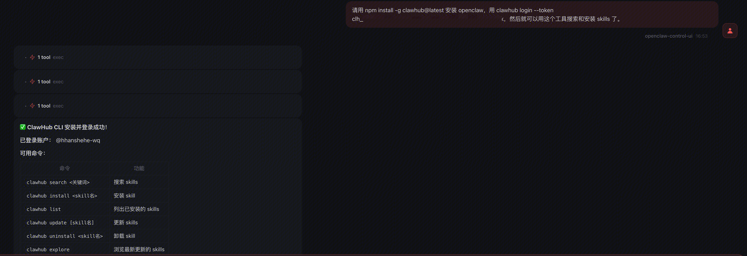 请用 npm install -g clawhub@latest 安装 openclaw,用 clawhub login --token 【这里换成你的 token】登陆,然后就可以用这个工具搜索和安装 skills 了。