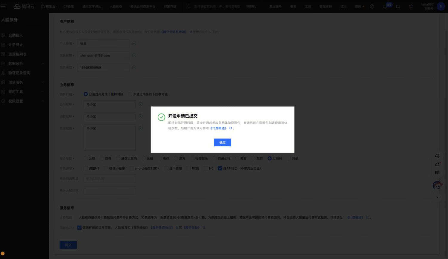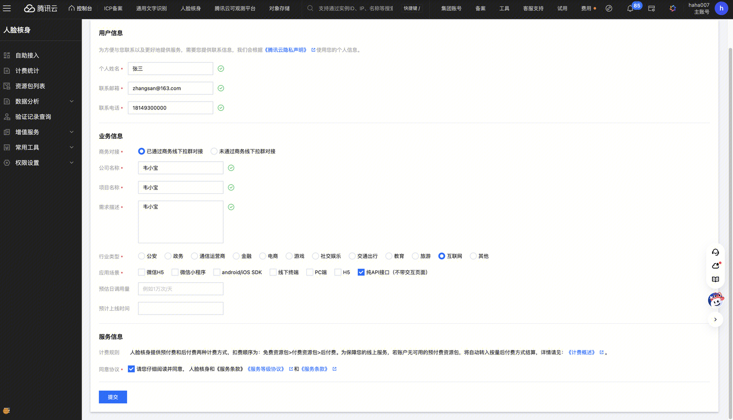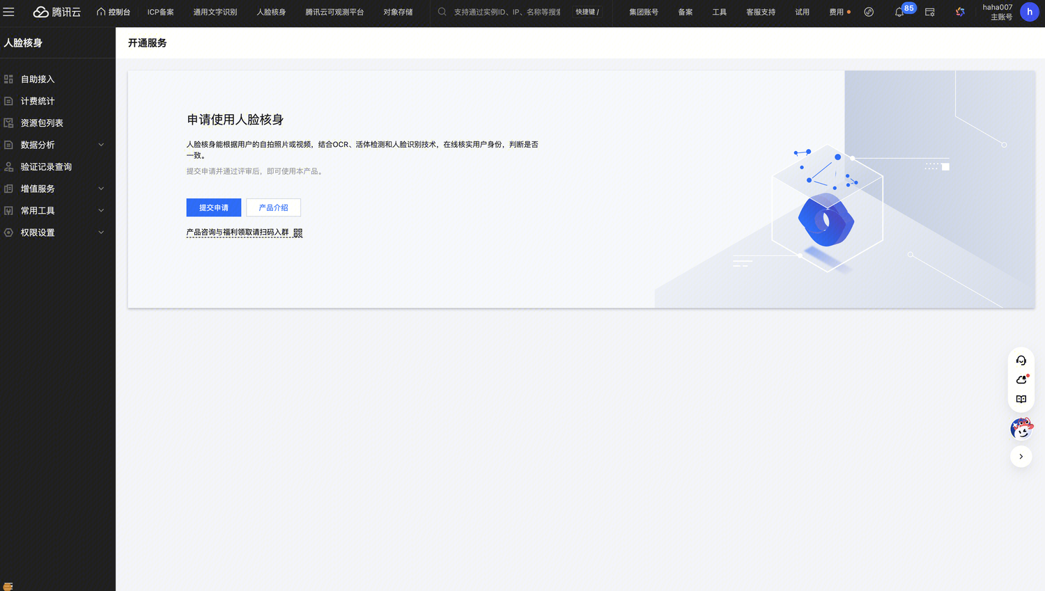 注意: 人脸核身服务要求腾讯云账号完成企业实名认证,个人实名认证无法开通该服务。