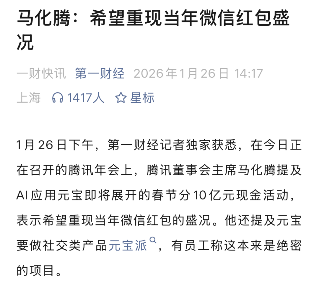 1月26日腾讯2026年会上,马化腾直接扔出重磅猛料——AI应用元宝要在春节推出10亿现金红包活动!