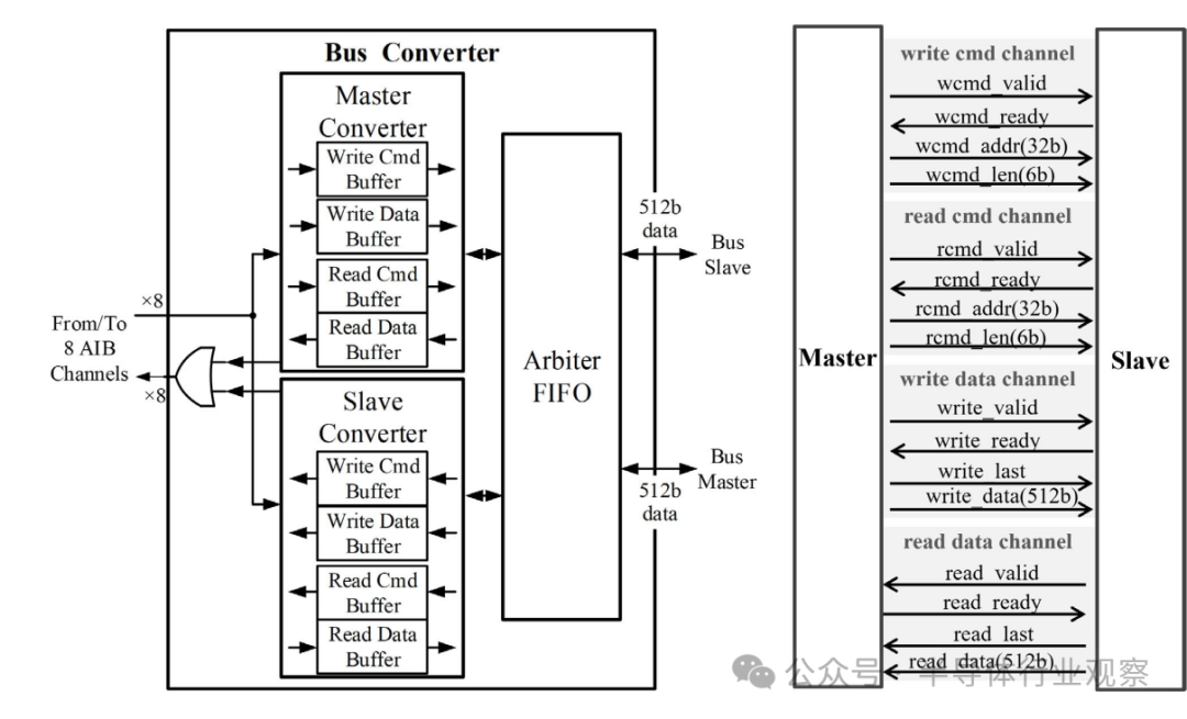 图11 兼容AXI的系统总线:总线转换器(左)以及总线接口通道和信号(右)