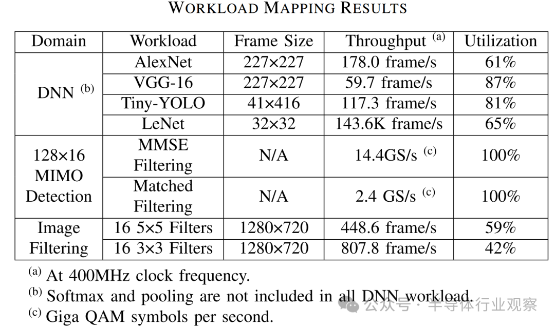 我们展示了可以利用Arvon的各种应用的工作负载映射,包括深度神经网络(DNN)、多输入多输出(MIMO)信号处理和图像滤波。工作负载大小、总体吞吐量和利用率在表III中进行了总结。除了常用的DNN模型外,128×16 MIMO检测工作负载利用128个接收天线来检测16个单天线用户。此任务涉及的处理包括最小均方误差(MMSE)滤波操作,该操作需要使用矩阵-矩阵乘法(MMM)计算滤波矩阵,然后使用MMM应用滤波矩阵。为了执行这些操作,需要使用尺寸为32×256、256×32、32×32和32×1的MMM核来完成此工作负载。这些计算核可以高效地映射到PE阵列,利用率达到100%。图像滤波工作负载涉及16个5×5的滤波器和16个3×3的滤波器,这些二维滤波器应用于1280×720的图像帧,这些操作均需要采用卷积核来进行。不过,由于滤波器尺寸较小,其利用率低于其他工作负载。这些示例工作负载的结果表明,Arvon的异构SiP架构为神经网络(NN)和通信处理提供了灵活性、性能和效率。