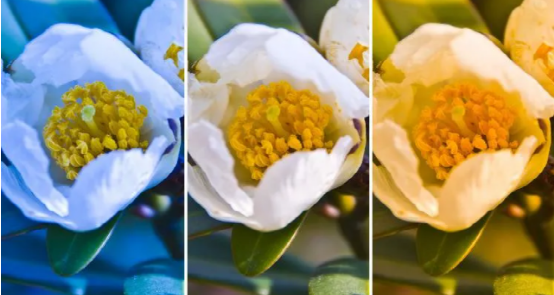 如上图所示,左1色温偏冷,中间色温正常,右一色温偏暖。上图比较直观的展示了色温的概念。偏冷的色温会给人一种还冷的感觉,偏暖的色温会给人一种温暖的感觉。