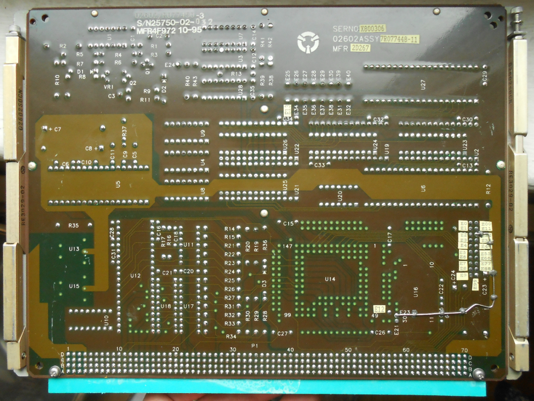 这些电路板上标有 CAGE 代码 02602,这是 Rocketdyne 公司(现为 Aerojet )的标志。据作者所知,Rocketdyne 公司除了火箭发动机之外,似乎从未生产过其他产品,所以认为这些电路板很可能来自某种火箭发动机控制器。但是并不知道它们来自哪种类型的发动机(商业运载火箭、NASA 航天活动、军用导弹等等),但上面的日期代码都显示是 1995 年左右。