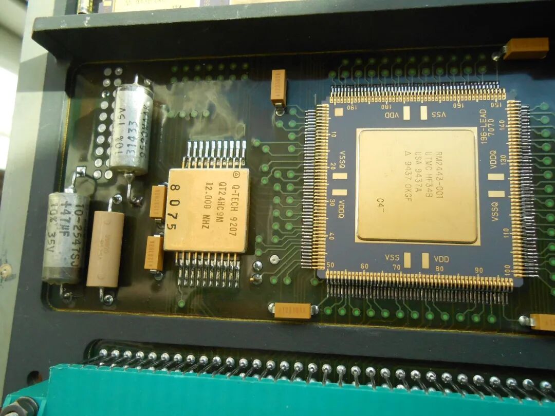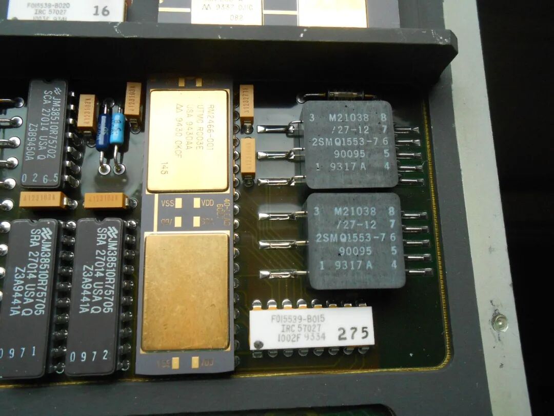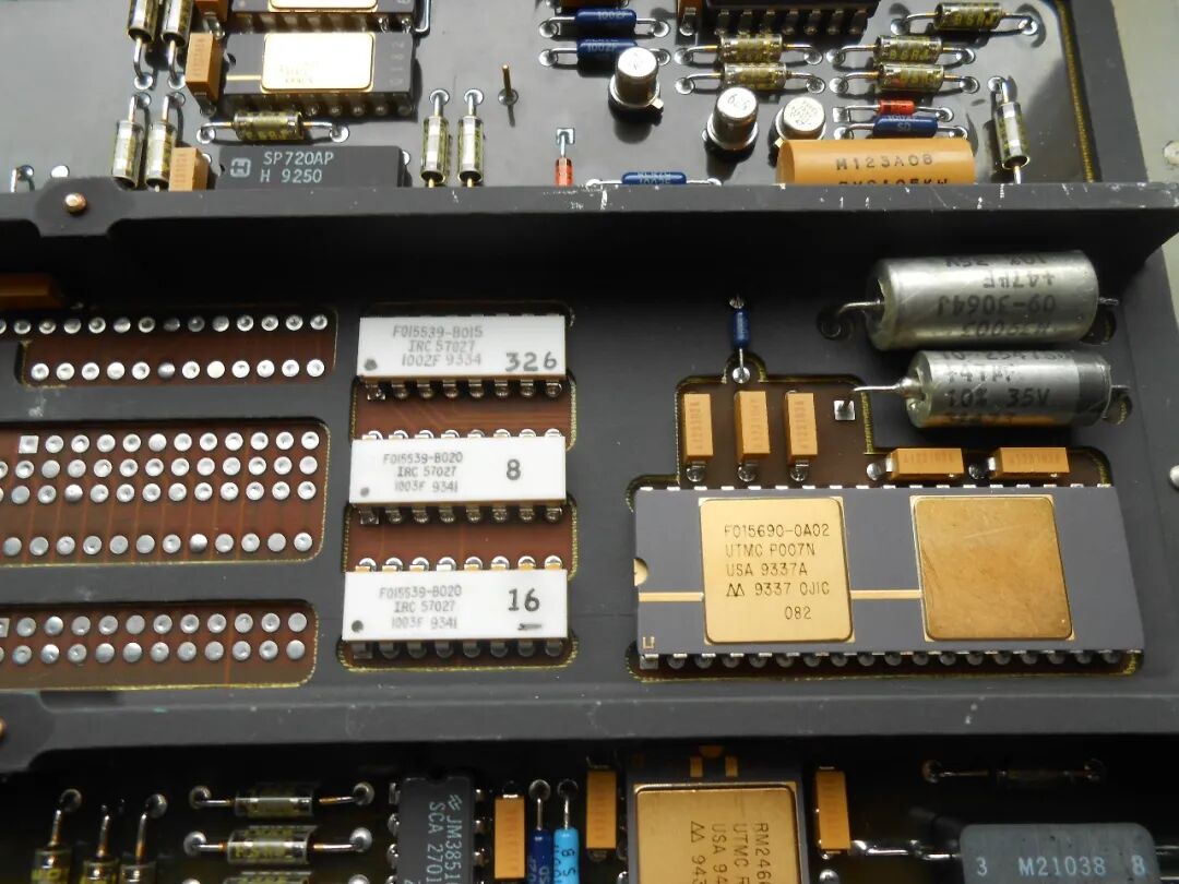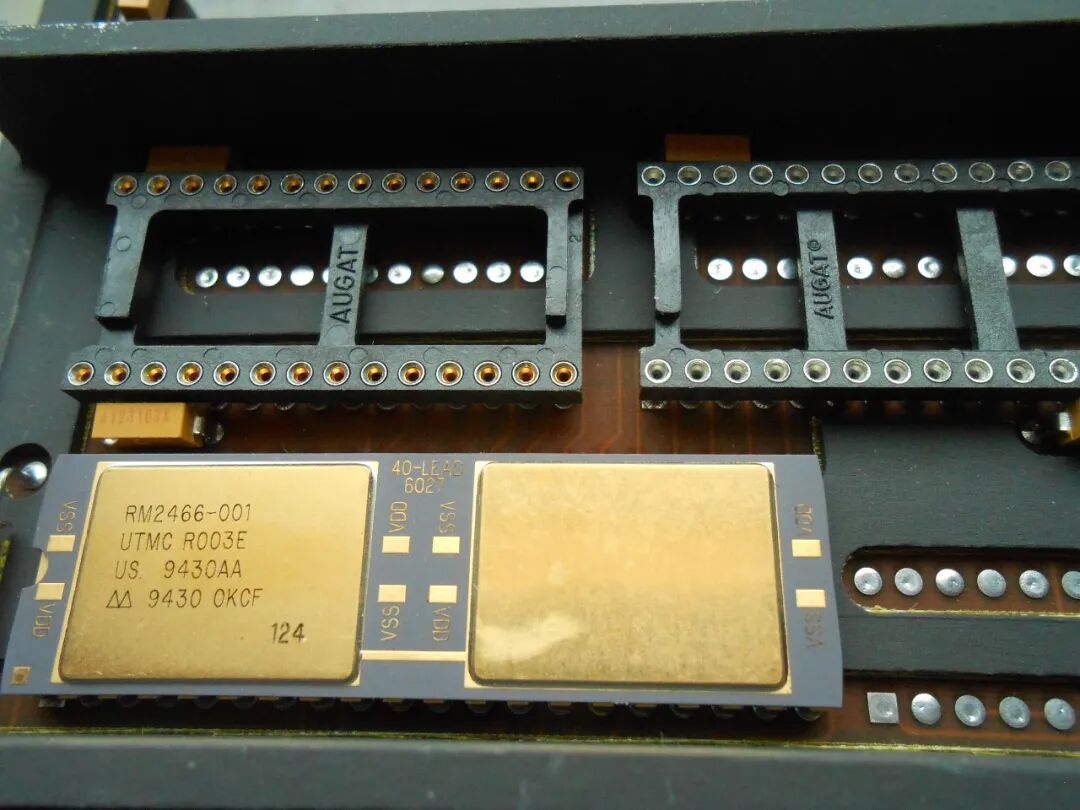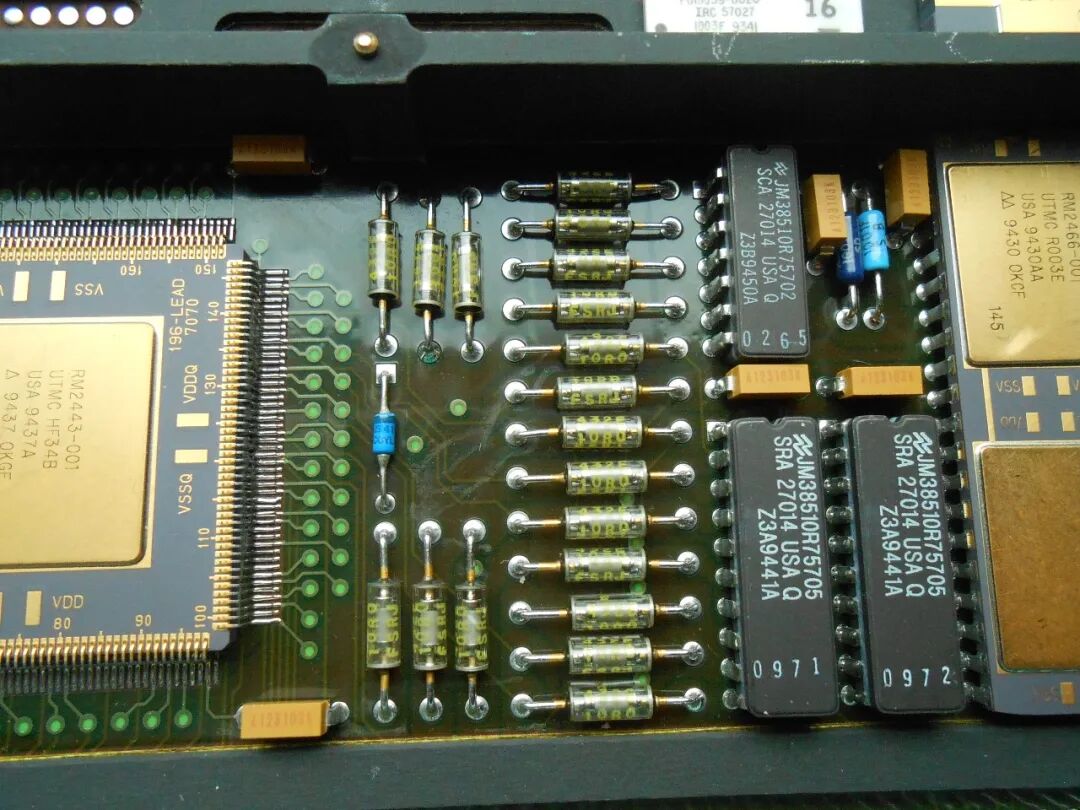 称之为CPU板,是因为它的左下角看起来像是处理器和内存:这块板上的零件编号几乎都是定制的,以“RM”(可能是Rocketdyne Microelectronics?)开头,但我们可以看到这颗芯片是由UTMC(联合技术公司旗下的硅芯片制造和封装部门)生产的。CPU(?)旁边的12MHz振荡器几乎可以肯定是主时钟。
