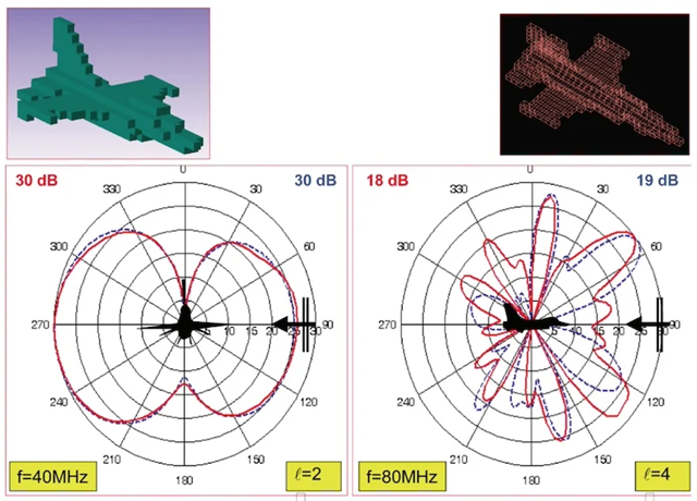 图示:15米长飞行器的离散FDTD模型与矩量法模型,及两种方法计算的水平/垂直雷达散射截面(RCS)变化曲线。图片来源:Research Gate