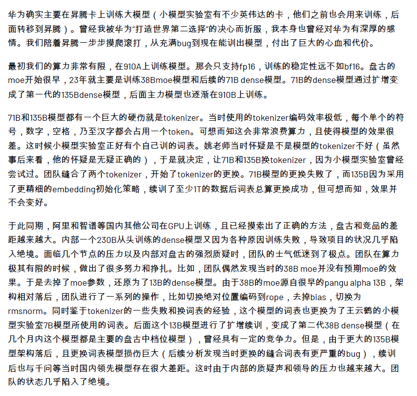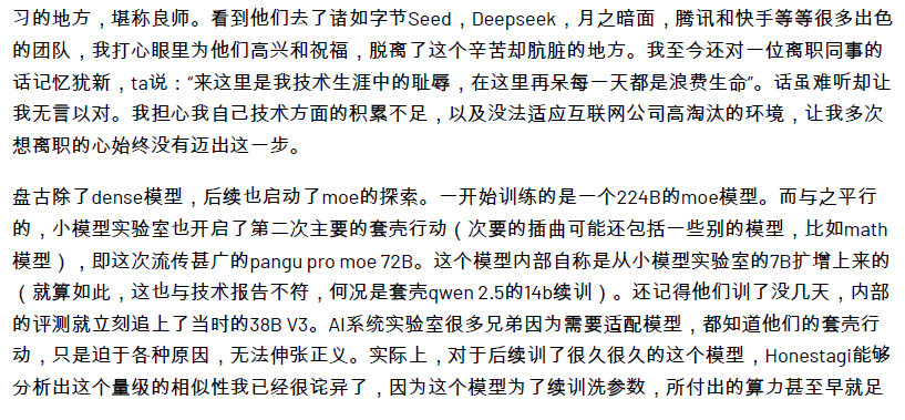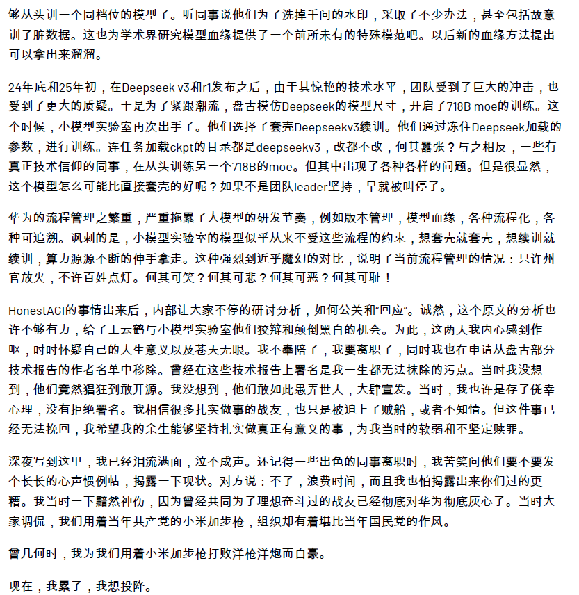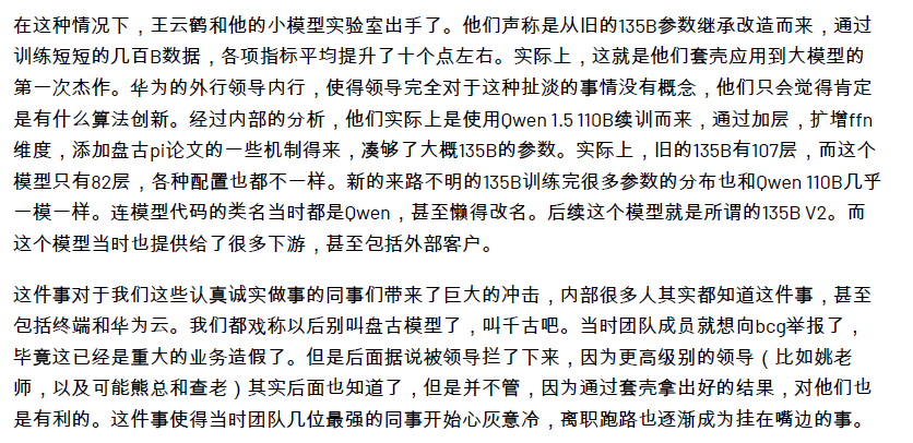 然而,就在7月6日凌晨,一位自称是盘古大模型团队的员工自爆,确实存在套壳、续训、洗水印的现象。