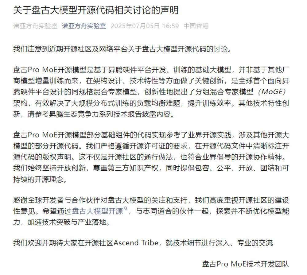 华为诺亚方舟实验室7月5日发布最新声明,表示盘古ProMoE开源模型是基于昇腾硬件平台开发、训练的基础大模型,并非基于其他厂商模型增量训练而来。