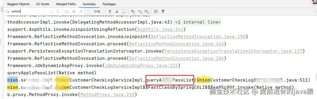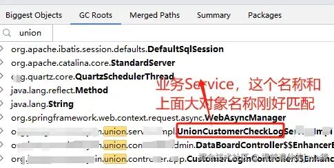 我们搜索自己的业务包名字就行了,这样就能很快定位关键问题。发现存在service 名称 和 上面大对象的名称一致UnionCustomerCheckLog