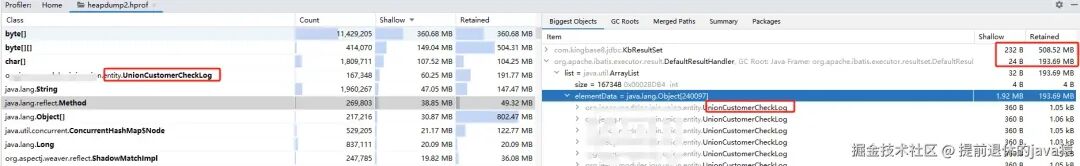 根本问题已经浮出水面了,KbResultSet、List<UnionCustomerCheckLog>这两个对象几乎把内存撑满了,jvm 堆内存最大1024M 这两个就占了700M. 算是定位到问题了吧! 也推翻了技术经理说的调用远程接口大量请求被阻塞的问题。