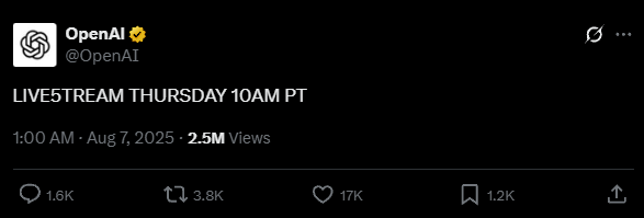 昨日,OpenAI官方在X平台发文,称将于太平洋时间周四上午10点(北京时间周五凌晨1点)开启直播活动。
