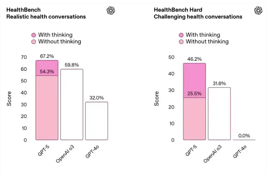 低幻觉率:在HealthBench Hard Hallucinations测试中,GPT-5的错误信息率仅1.6%,远低于GPT-4o(15.8%)和o3(12.9%)。