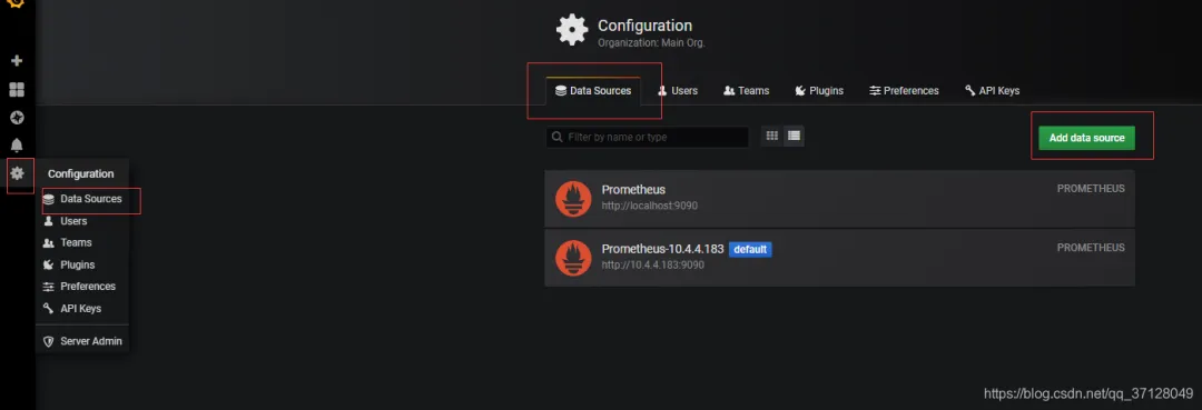 浏览器输入:ip地址+3000 进入Grafana 默认账户和密码都是admi,点击小齿轮,点击 Data Sources。