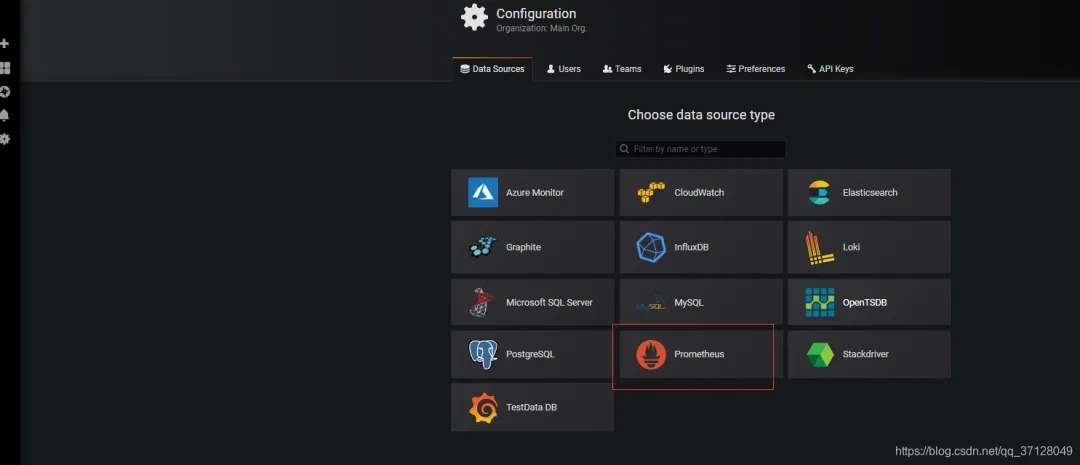 点击右侧 Add data source 选择Prometheus。