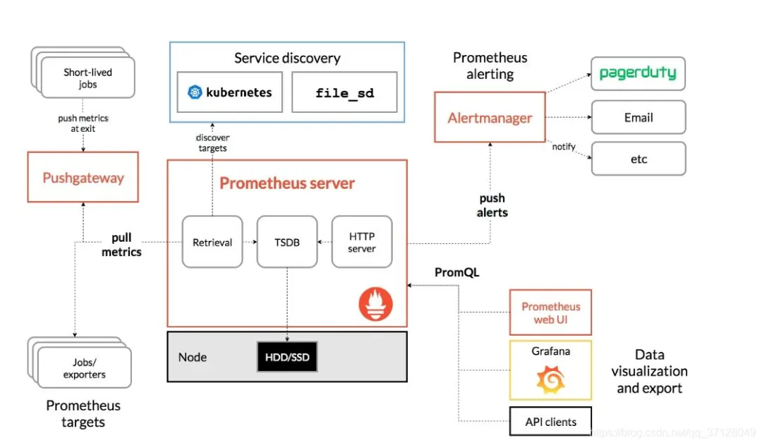Prometheus作为一个中间点,而Grafana作为可视化展示,后面的exporter作为监控,exporter将需要获取的数据获取并连接到Prometheus,而Prometheus连接到Grafana,直观展示被监控者状态;