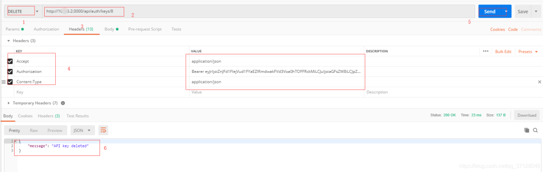 拿到需要删除的ApiKey的id,然后使用Delete请求方式,在最后带id即可删除对应id的ApiKey,图示如下: