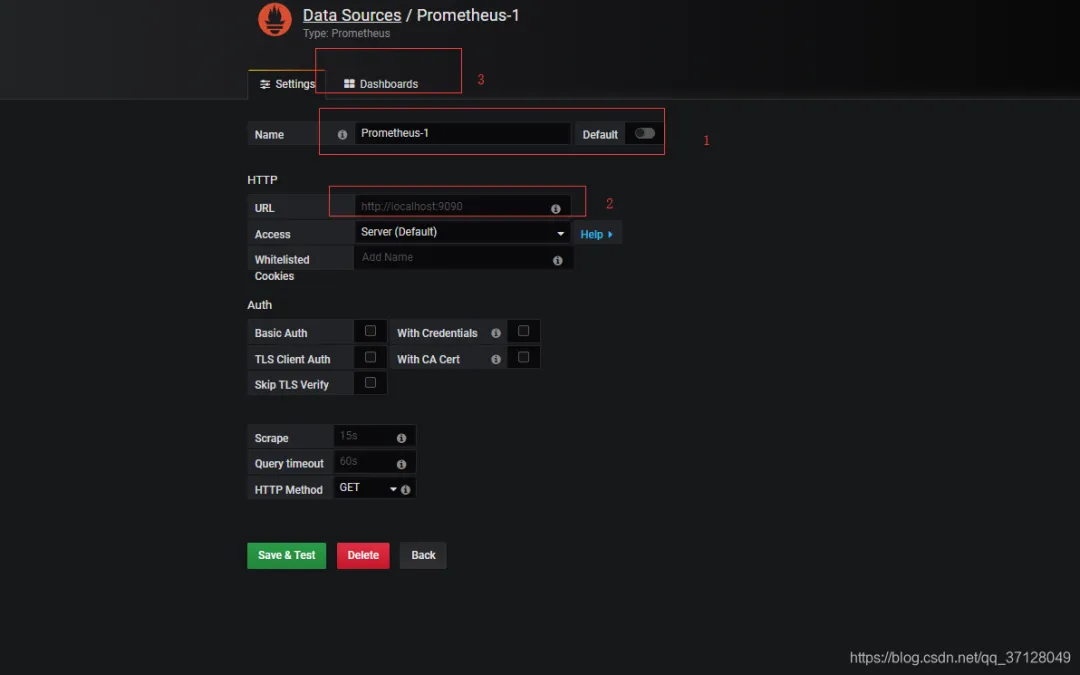编辑Prometheus的配置信息,Name为名称,URL为 http://promethues的服务器地址和端口号(9090)。
