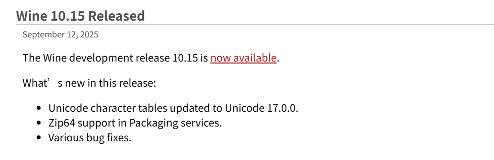 Wine 10.15 将 Unicode 字符表同步至最新标准,改善了多语言环境下的文本显示(如中文、日文输入法兼容性)。