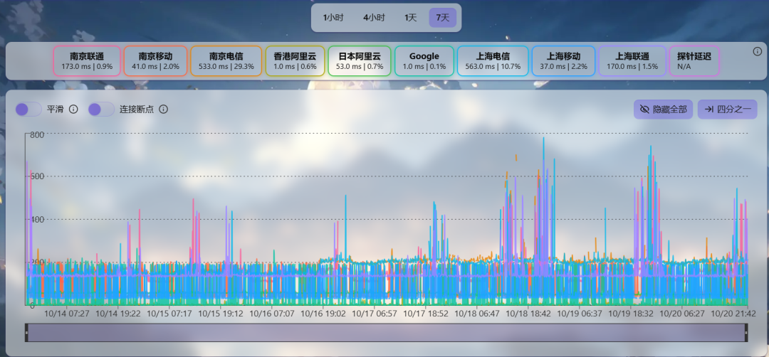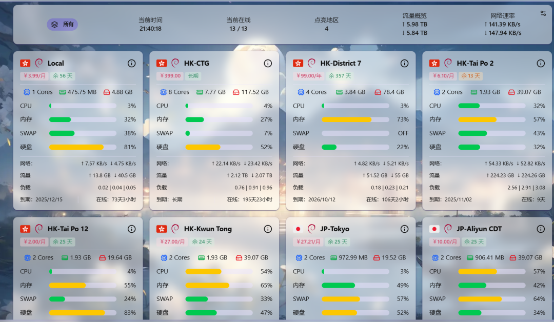 全局视图:展示所有服务器的在线状态(绿色/红色标记)、总流量和实时速率。