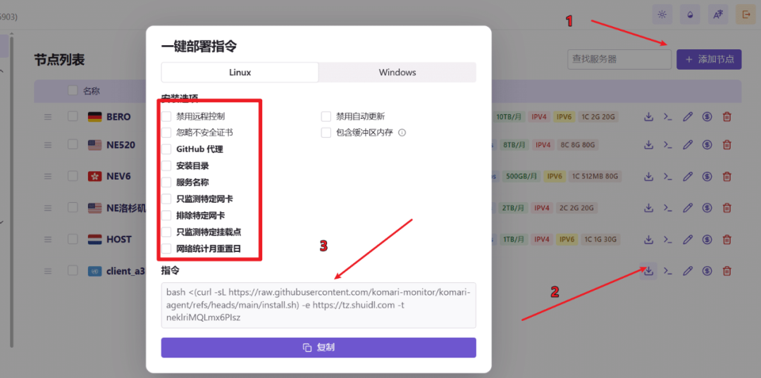 Komari 的 Agent 是轻量级数据采集器,资源占用极低(内存<10MB)。从 Komari Web 界面的 “添加服务器” 页面获取下载链接。