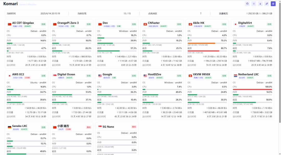 Komari 作为轻量级自托管服务器监控工具,其核心价值在于极简架构、低资源占用(Agent 内存占用稳定在 10MB 以内,CPU 使用率几乎忽略不计,树莓派到企业级服务器均可流畅运行。)和直观的可视化,适合个人开发者、小型团队或边缘计算场景。