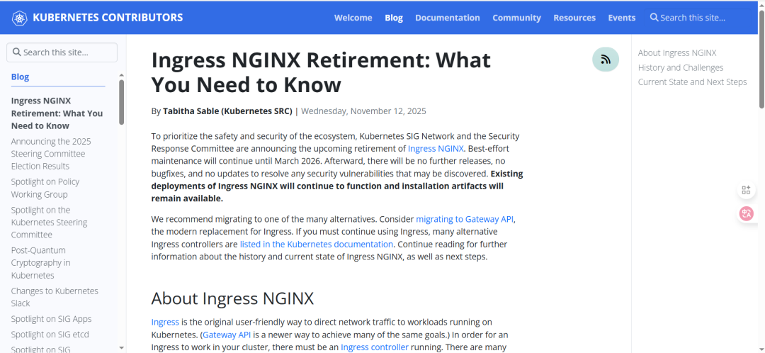 然而,技术发展如逆水行舟,随着 Kubernetes 生态对安全性、标准化和可维护性要求的提升,Ingress NGINX 因技术债累积和维护挑战,最终在 2026 年 3 月走向退役。