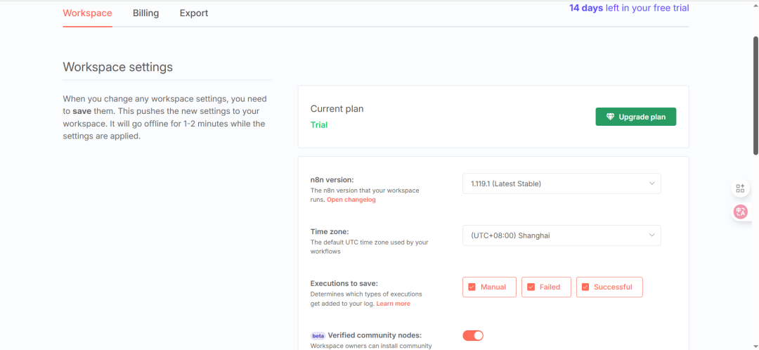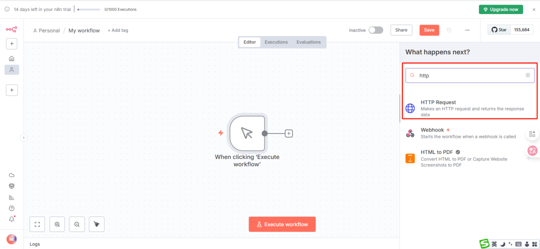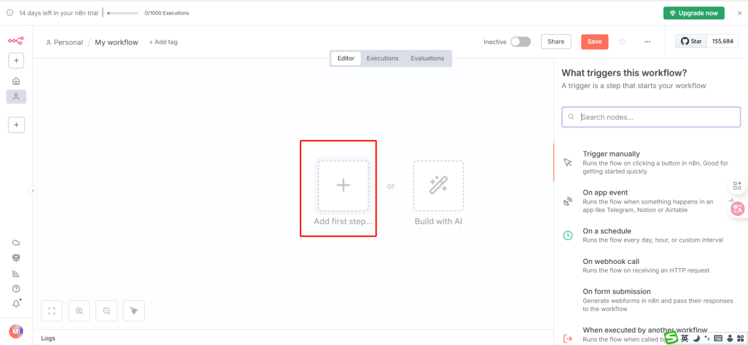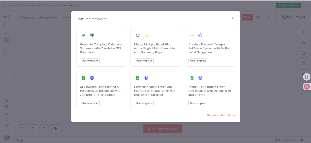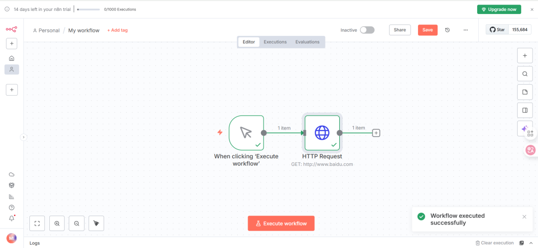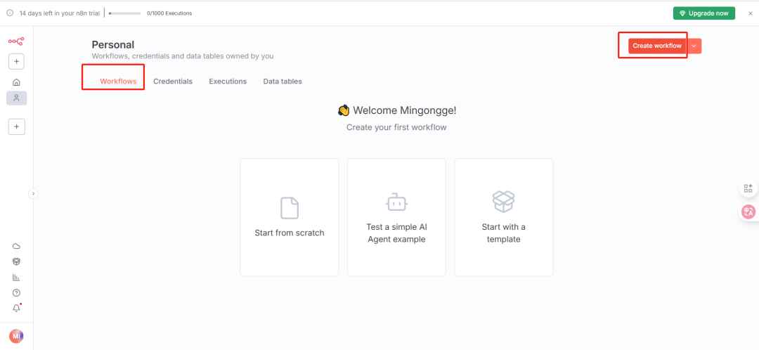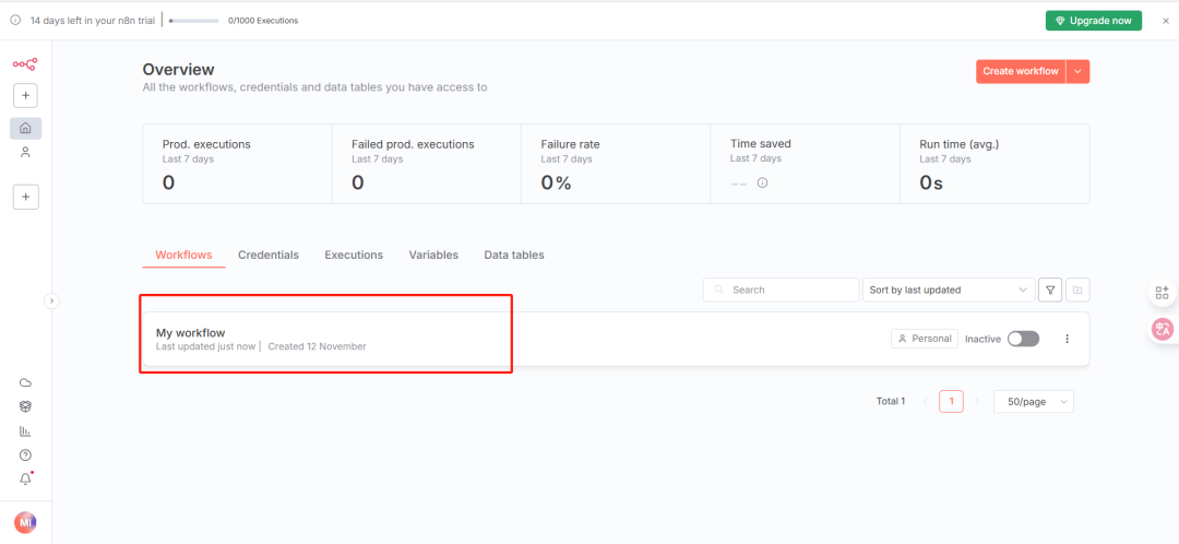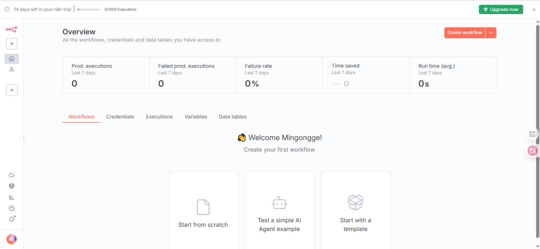 注册成功后,即可开始创建和测试工作流,注:14 天免费试用期内可体验全部功能。