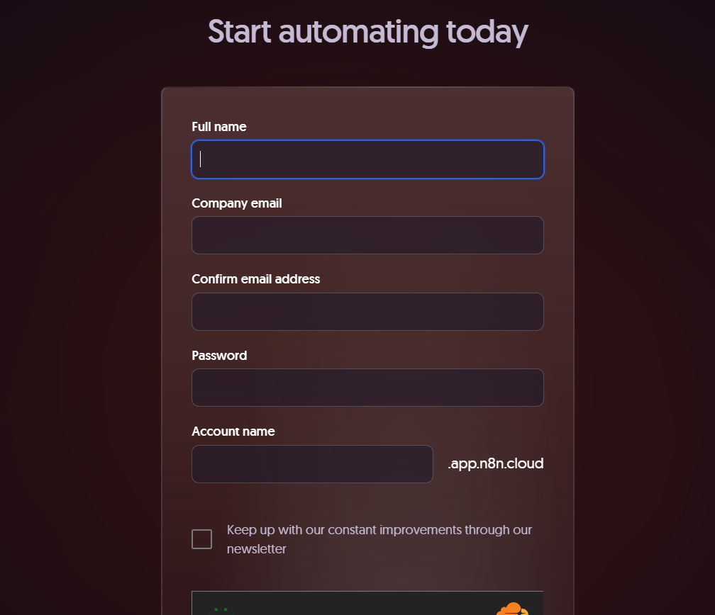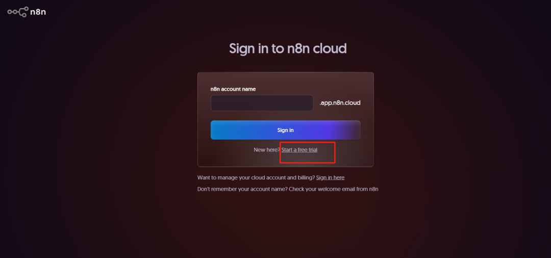 方式一:访问 N8N Cloud 官方网站(https://app.n8n.cloud/login),点击“Start a Free Trial”,按要求填写注册信息。