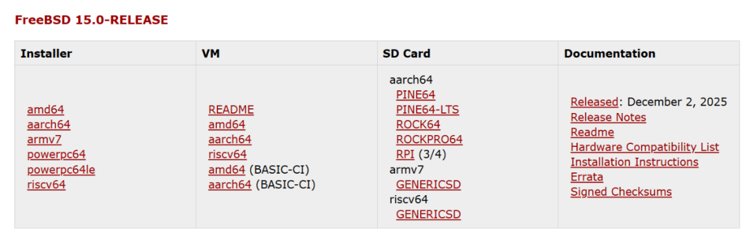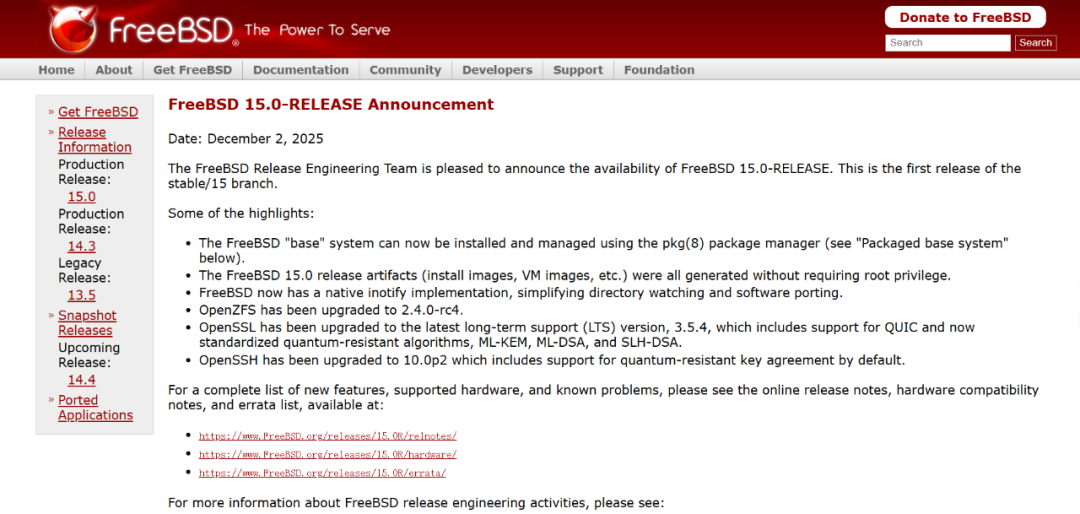 2025 年 12 月 2 日 FreeBSD 15.0 正式发布,其核心变革围绕 Pkgbase 系统管理架构展开,同时在安全性、硬件支持、云原生适配及用户体验方面实现全面升级。