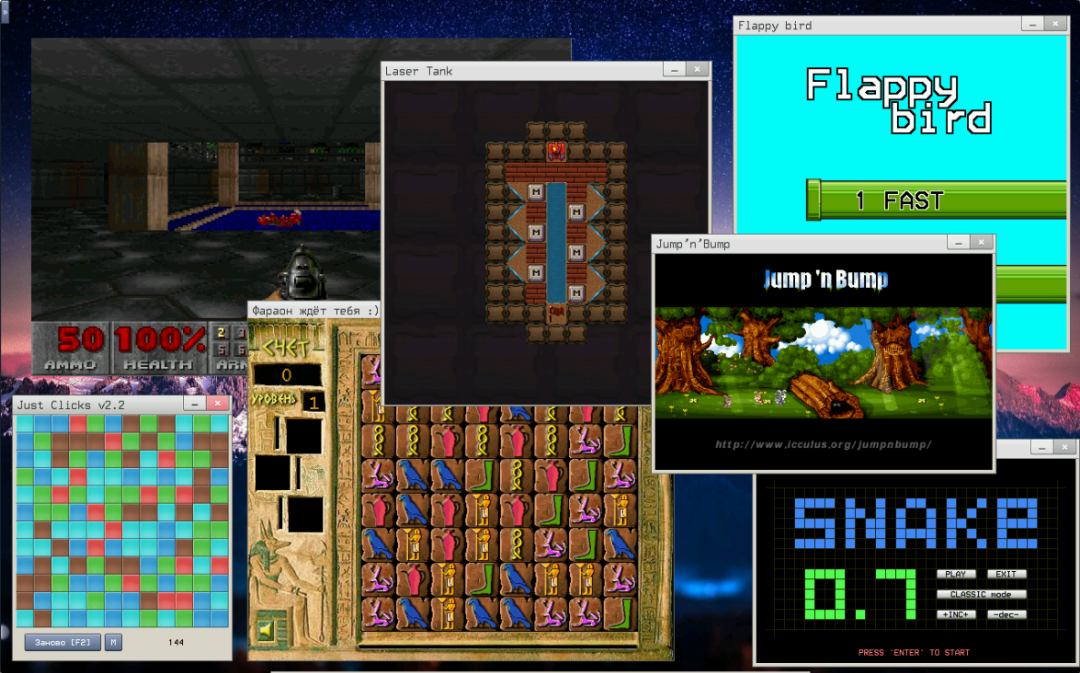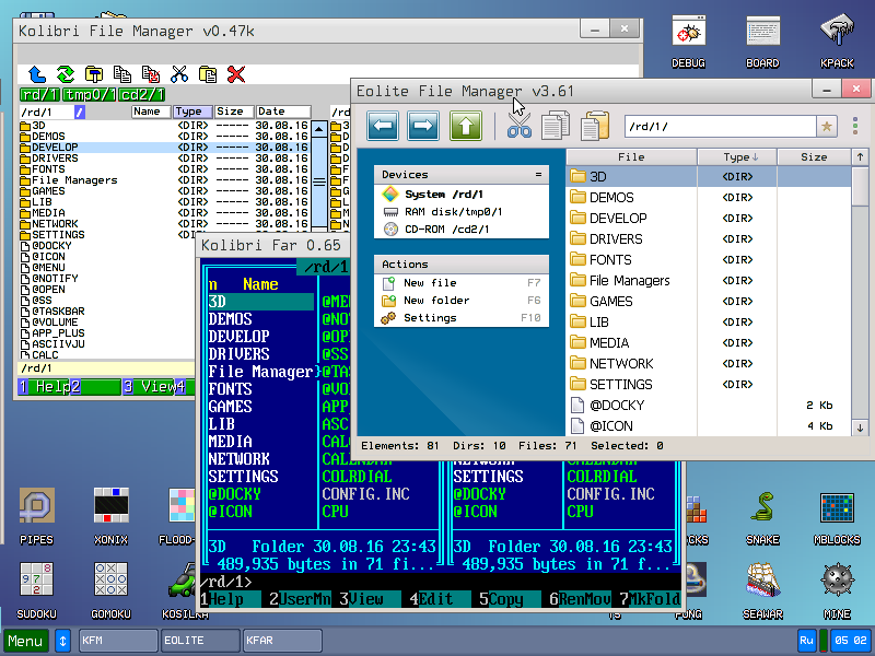 应用程序包含文件管理器、文本编辑器、图像查看器、简单网页浏览器、媒体播放器及超过 30 款游戏(如 Doom、Quake 的精简版)。