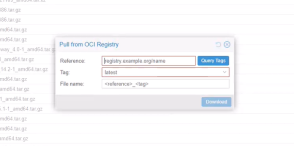 步骤 2:点击 “Pull from OCI Registry”,输入镜像名称(如 jeessy/ddns-go),点击 “Query Tags” 选择标签(如 latest),等待下载完成。