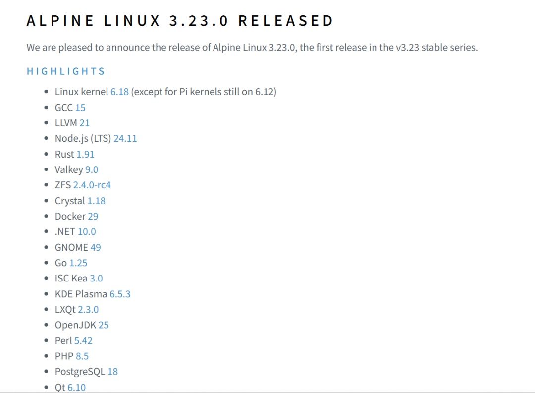 Alpine Linux 3.23 的此次更新,在内核、开发工具链、桌面环境、包管理工具等关键领域均实现了显著升级。